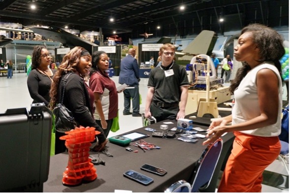Heaven Whitby shares information about the FVSU Fab Lab during the Middle Georgia Innovation Corridor held at the Warner Robins Museum of Aviation for Georgia AIM Week.