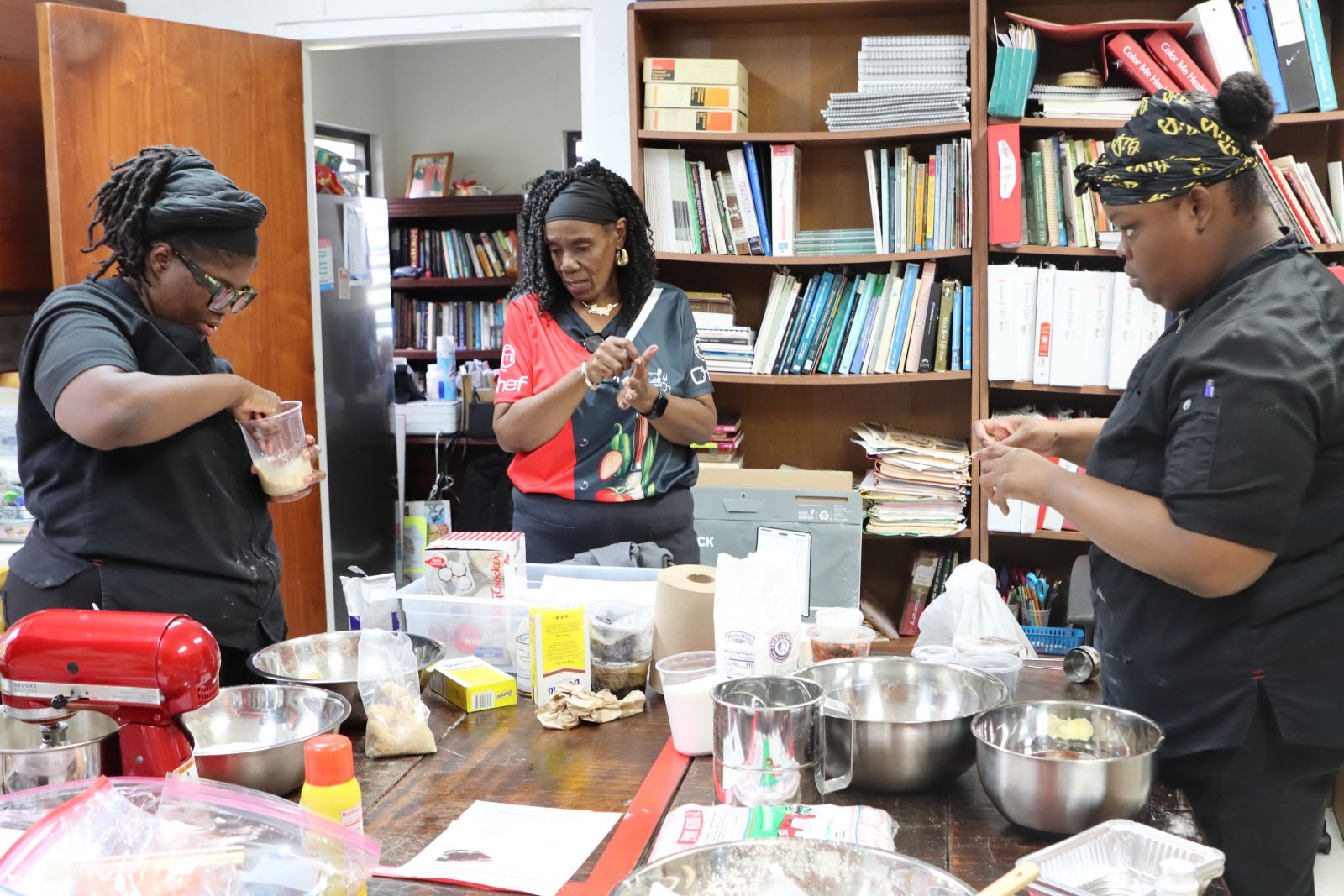Shoy instructs students by teaching them recipes.